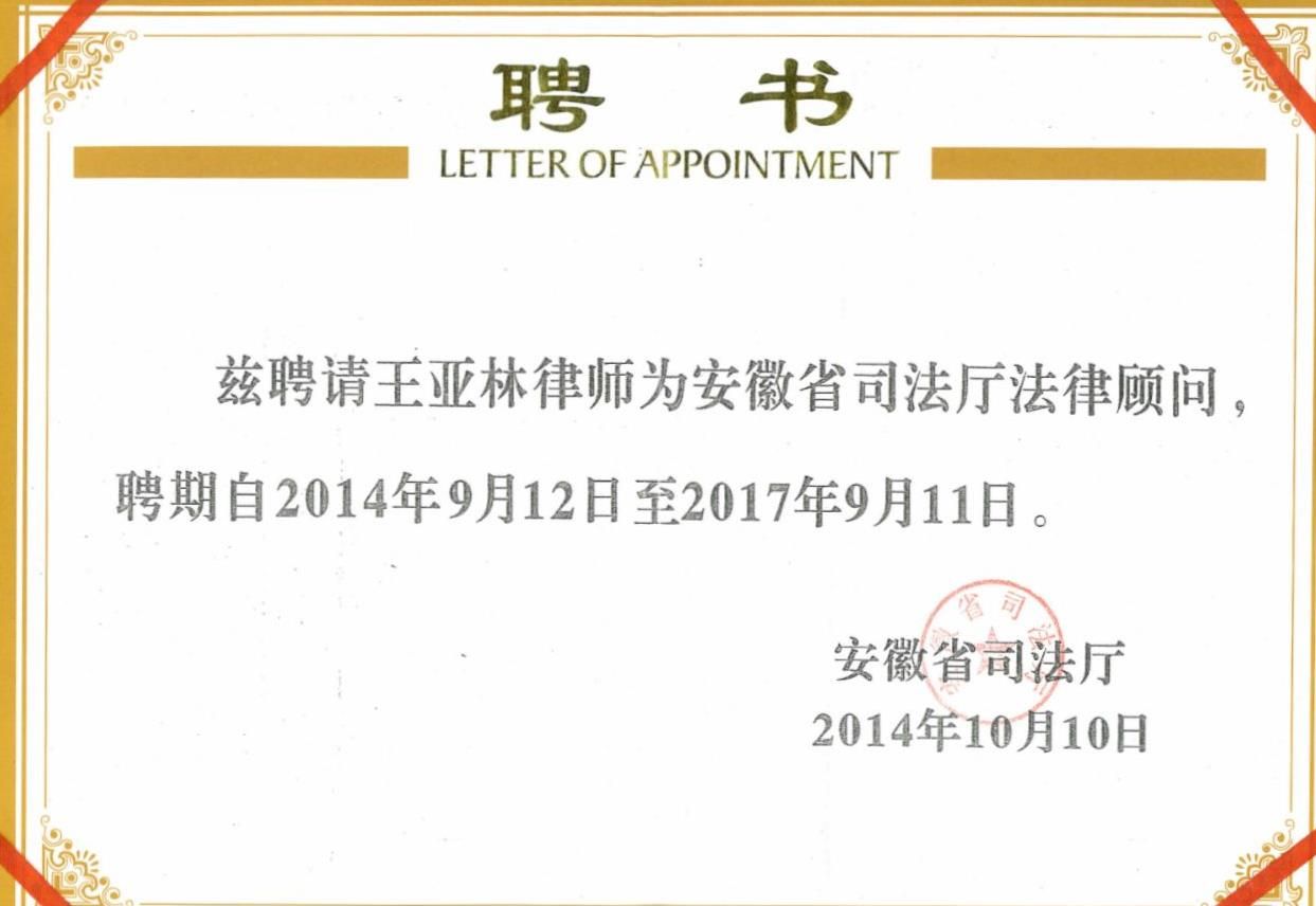 2014年10月10日王亞林、陳沅兩位律師從安徽省司法廳廳長洪禹候手中接過聘書,正式成為安徽省司法廳機(jī)關(guān)法律顧問,標(biāo)志著該省司法行政系統(tǒng)建立法律顧問制度工作向前邁出堅實一步。