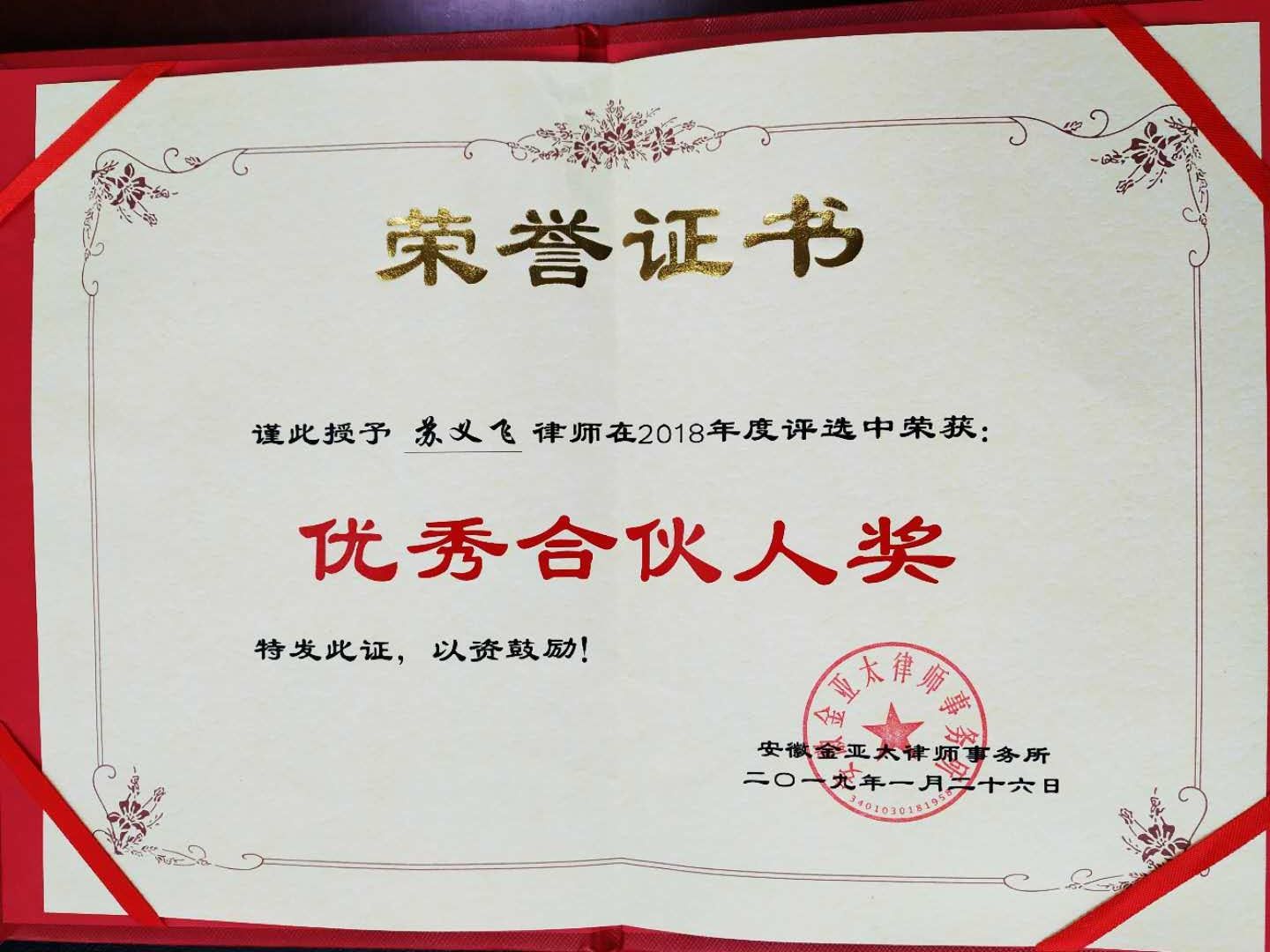 2019年1月26日,第26屆安徽金亞太律師事務(wù)所年會(huì)成功舉辦,經(jīng)過113名律師投票選舉,安徽金亞太律師事務(wù)所高級(jí)合伙人蘇義飛律師榮獲2018年度優(yōu)秀合伙人稱號(hào)。