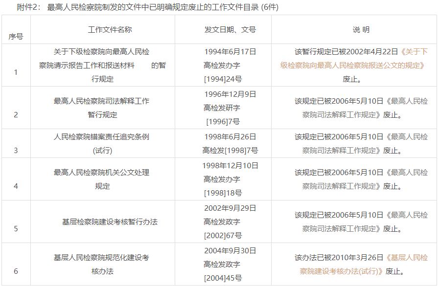 二、 為便于工作和查詢,對最高人民檢察院制發(fā)的文件中已經(jīng)明確規(guī)定廢止的《關(guān)于下級檢察院向最高人民檢察院請示報(bào)告工作和報(bào)送材料的暫行規(guī)定》等6件工作文件目錄,予以統(tǒng)一公布(見附件2)。