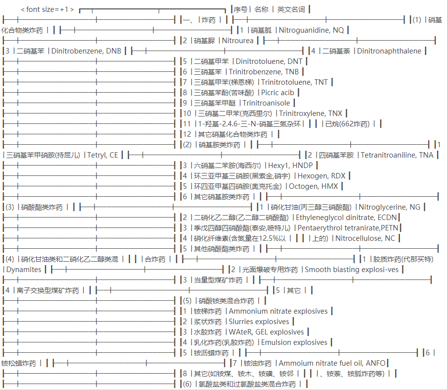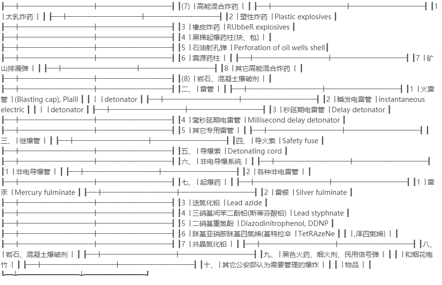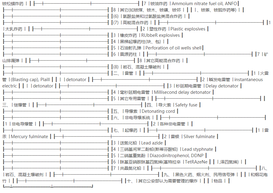 根據(jù)最近國務院發(fā)布的《中華人民共和國民用爆炸物品管理條例》第二條規(guī)定,經(jīng)與兵器工業(yè)部研究確定,現(xiàn)將爆炸物品名稱公布,望遵照執(zhí)行。