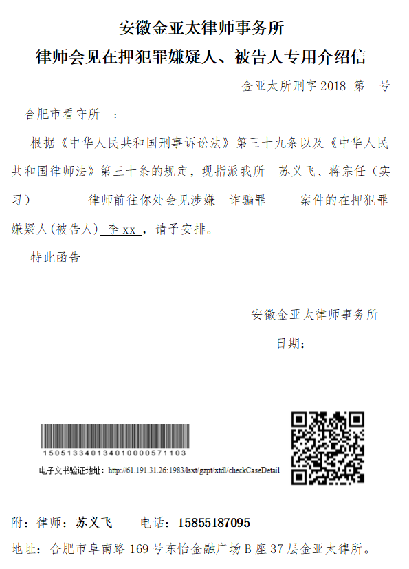 根據(jù)《中華人民共和國刑事訴訟法》第三十九條以及《中華人民共和國律師法》第三十條的規(guī)定,現(xiàn)指派我所 蘇義飛、蔣宗任(實習(xí)) 律師前往你處會見涉嫌 詐騙罪 案件的在押犯罪嫌疑人(被告人) 李xx ,請予安排。