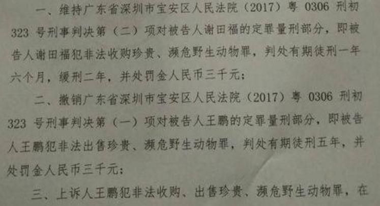 深圳中院判決,撤銷一審判決對王鵬的定罪量刑部分,判決王鵬犯非法收購、出售珍貴、瀕危野生動物罪,在法定刑以下判處有期徒刑二年,并處罰金人民幣三千元。