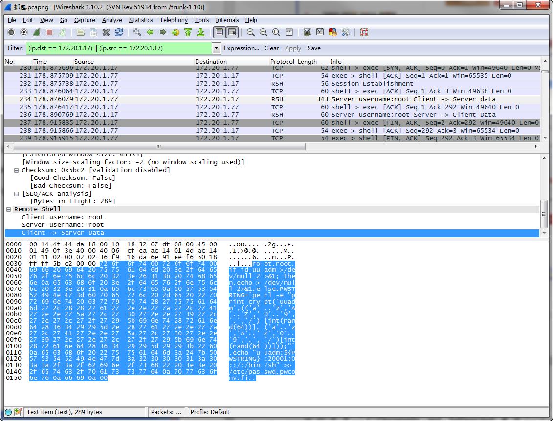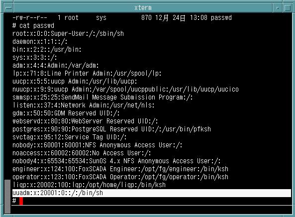 當(dāng)程序文件“solfitmgr.exe”向IP地址為“172.20.1.17”(即檢材3)的服務(wù)器發(fā)起RSH命令請(qǐng)求后(圖2),在檢材3的操作系統(tǒng)中創(chuàng)建名為“uuadm”的用戶,且檢材3中記錄操作系統(tǒng)用戶的文件“/etc/passwd”中增加了一條相關(guān)記錄“uuadm:x:20001:0::/:/bin/sh”(圖3)。